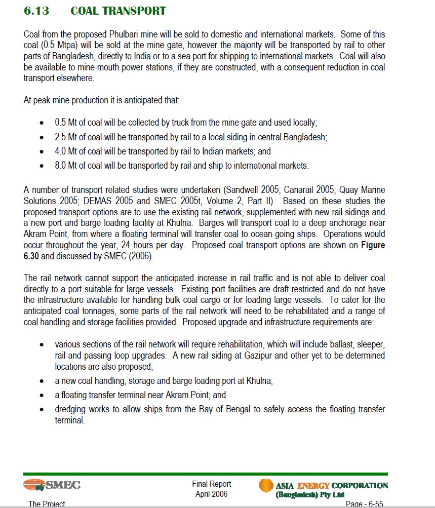 ফুলবাড়ী কয়লা প্রকল্প নিয়ে এশিয়া এনার্জির পরিবেশ ও সামাজিক সমীক্ষা প্রতিবেদনের ভলিউম ১ অধ্যায় ৬ এ বলা হয়েছে: